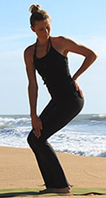 pads. With hands on hips curl the back toes under and press firmly into the front foot